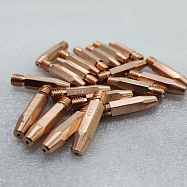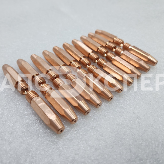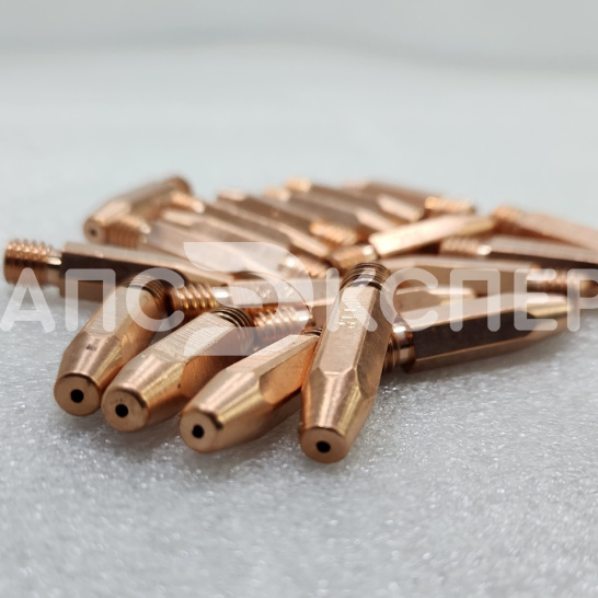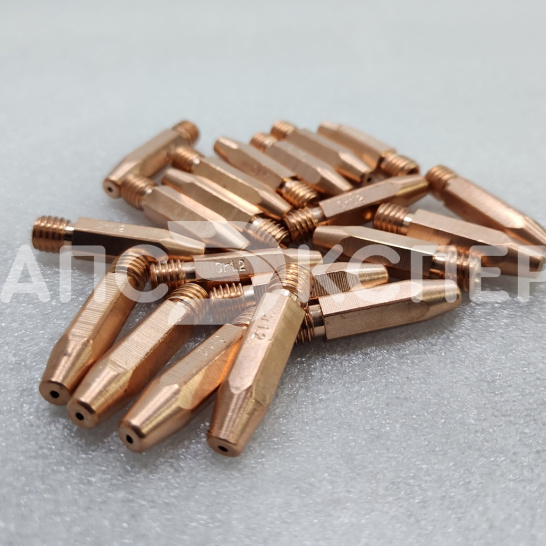 Усиленный контактный наконечник из сплава меди, хрома и циркония (CuCrZr) для полуавтоматической сварки. Предназначен для работы со сплошной и порошковой проволокой диаметром 1.2–1.6 мм. Длина 35 мм и резьба М8×1.2 обеспечивают совместимость с горелками стандарта RF-45 и аналогами.